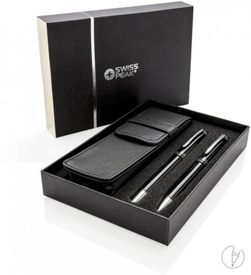 Authentic pen set bearing all the hallmarks of classic quality. High quality heavy brass metal rollerball with stylus and ball point pen with Swiss Peak branding. Including premium PU leather pouch and giftbox