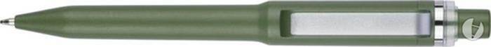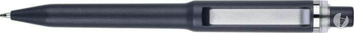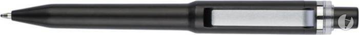 Recycled ABS ballpen designed in the shape of a travel mug, with a metallic finish. Features a push mechanism, a plastic pusher, a clip, and a chromed plastic ring at the top. Includes an in-mould recycled ABS logo.