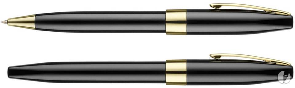 Writing set with gold trims packed in a box made of elegant black velvet. In a set there is a ball pen and roller pen.