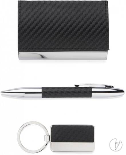 Elegant gift set which includes business card holder, key chain and a ball pen. All packed in a black box.