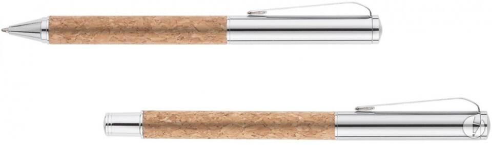 Elegant writing set for lovers of natural, environmentally friendly materials. The set includes a ball pen and rollerball pen made of metal and cork. A