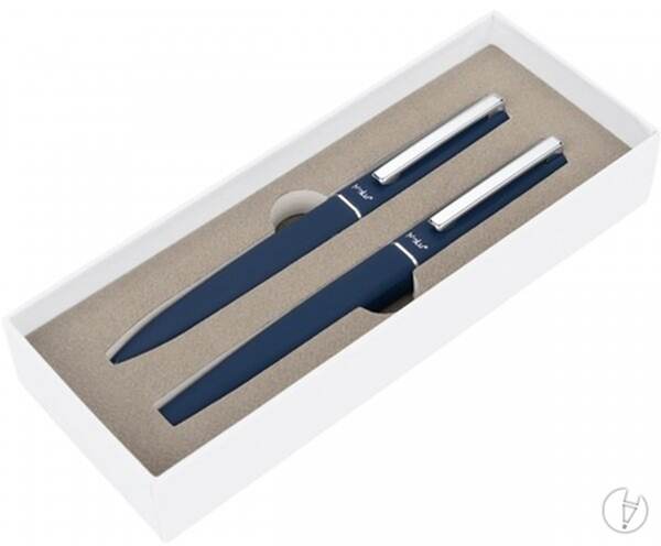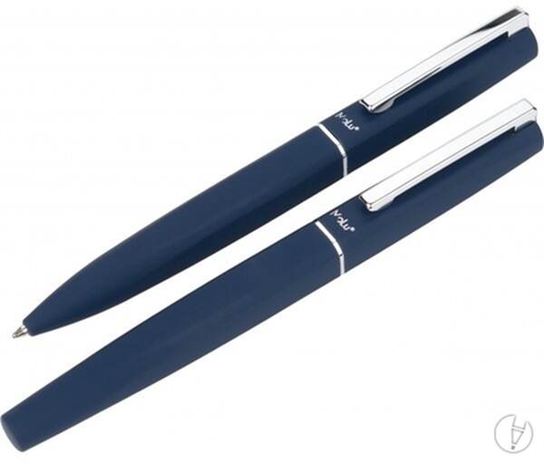 MoLu brand writing set of a ballpoint pen and a rollerball pen, made of recycled stainless steel. Both writing instruments have a rubber coating and gun-metal accents.